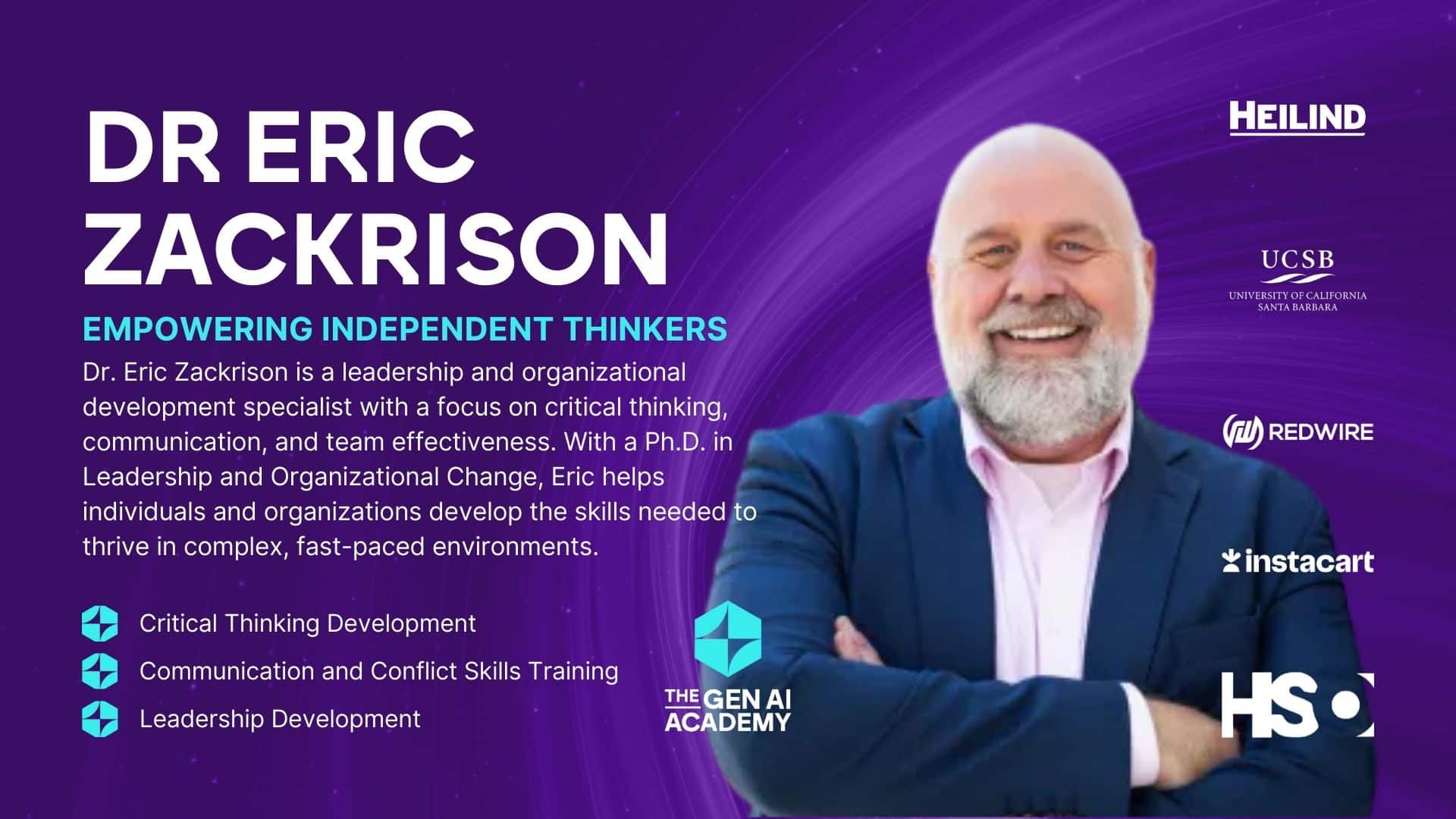 الدكتور إريك زاكريسون هو متخصص في القيادة وتطوير المنظمات، مع التركيز على التفكير النقدي والتواصل وفعالية الفريق. حائز على درجة الدكتوراه في التواصل التنظيمي وماجستير إدارة الأعمال، يجمع إريك في استشاراته وتدريباته بين الدقة الأكاديمية والخبرة العملية لمساعدة الأفراد والفرق والمنظمات على تطوير المهارات اللازمة للنجاح في بيئات معقدة وسريعة التغير.