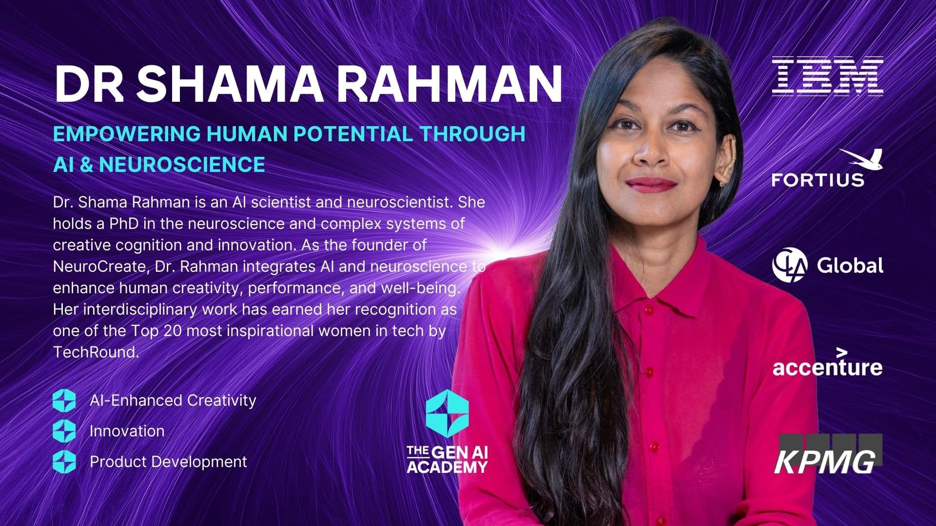 بصفتها مؤسِّسة NeuroCreate ورئيستها التنفيذية، تعتبر الدكتورة رحمان رائدة في مجال دمج الذكاء الاصطناعي وعلم الأعصاب بهدف الارتقاء بالإبداع البشري وتحسين الأداء المعرفي وتعزيز الرفاهية. تستفيد أعمالها الرائدة من الذكاء الاصطناعي لتطوير أدوات ذكية تعمل على تحسين التفكير الإبداعي وسير العمل، مما يمكّن الأفراد والمؤسسات من توسيع حدود الإمكانات.