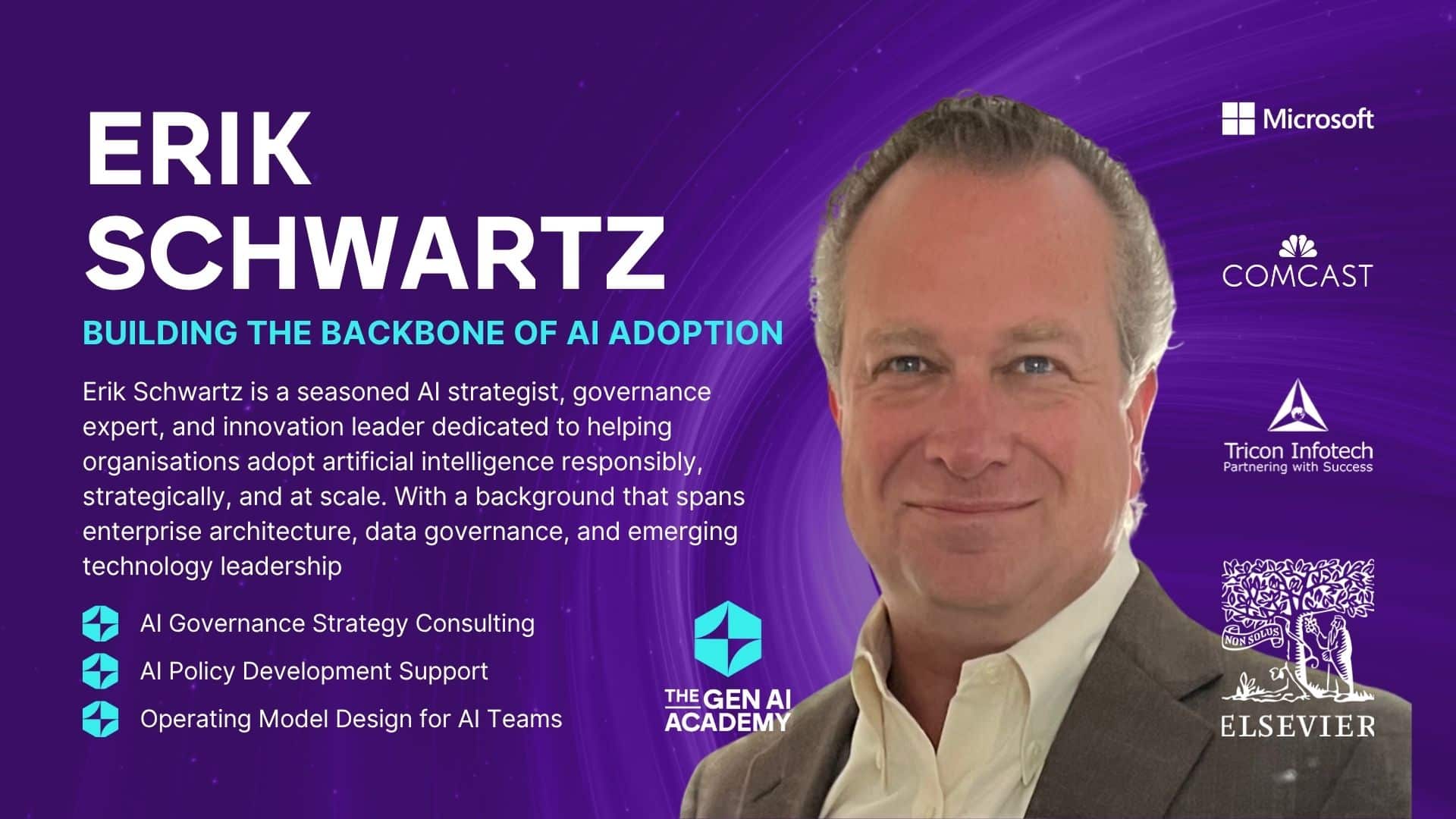 إريك شوارتز هو خبير استراتيجي رفيع المستوى في مجال الذكاء الاصطناعي والتحول الرقمي، ويتمتع بخبرة عميقة في تحويل التكنولوجيا المعقدة إلى حلول قابلة للتطوير في العالم الواقعي. بفضل خبرته التي تشمل مناصب قيادية في شركات Microsoft و FAST و Elsevier، ساعد إريك الشركات العالمية في بناء الهياكل التشغيلية والتقنية اللازمة لتبني الذكاء الاصطناعي بفعالية وتحقيق قيمة قابلة للقياس.