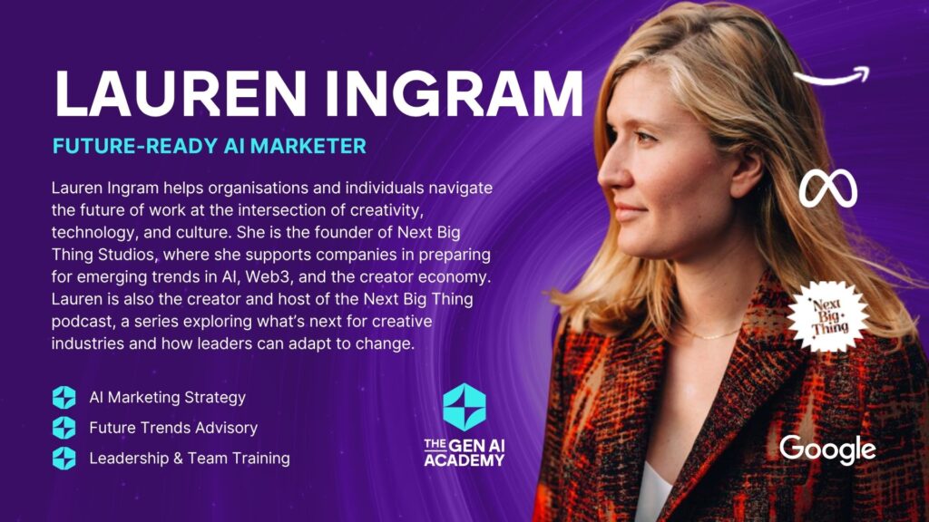 تساعد لورين المتخصصين في التسويق والإبداع على تحويل الاضطراب الناجم عن الذكاء الاصطناعي إلى فرصة من خلال فتح آفاق جديدة للتفكير والتواصل والنمو. يمزج عملها بين رؤية الاتجاهات المستقبلية والتطبيق العملي، مما يمكّن الفرق من استخدام الذكاء الاصطناعي ليس كبديل للإبداع البشري، بل كامتداد قوي له.