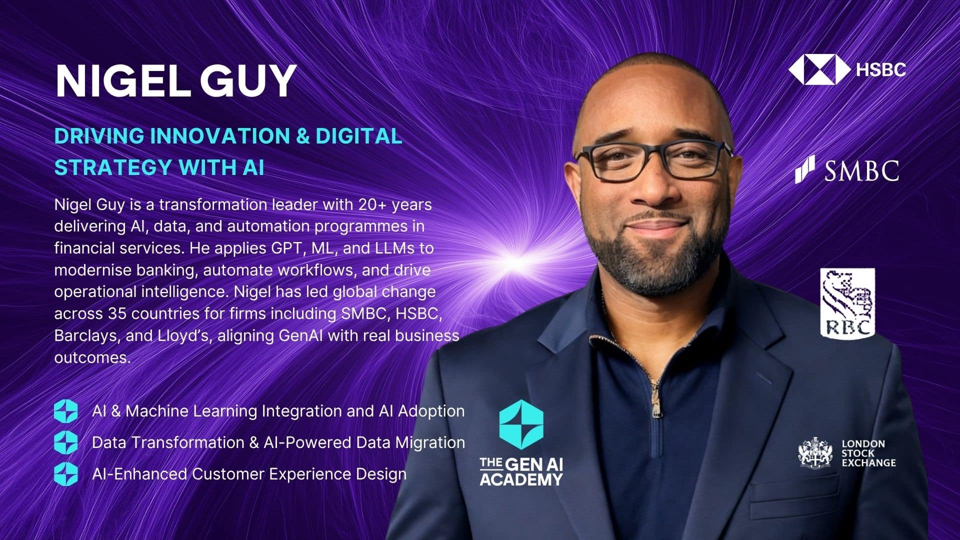 بفضل خبرته الواسعة في مجال استراتيجيات المؤسسات وتكامل الأنظمة واسعة النطاق وأنظمة اتخاذ القرار القائمة على الآلات، يشتهر نايجل بقدرته على دمج تقنيات GPT وأتمتة ML في البيئات القديمة بسرعة وعلى نطاق واسع. وقد نفذ برامج بقيمة تصل إلى 110 ملايين جنيه إسترليني، حيث قام بمواءمة أدوات الذكاء الاصطناعي وGenAI ضمن تكامل أنظمة تحويل البيانات مع النتائج التشغيلية والمتطلبات التنظيمية.